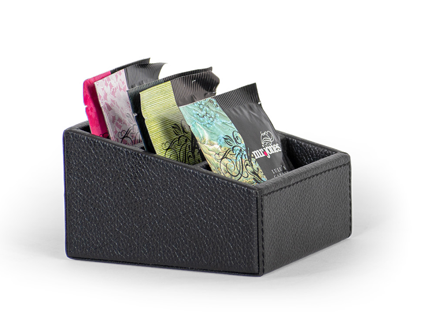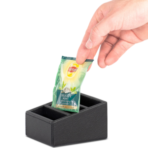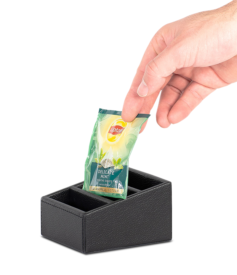 3 hólf til að geyma kaffihylki, tepoka og teskeiðar/hrærur. Innlegg sem hægt er að taka...
