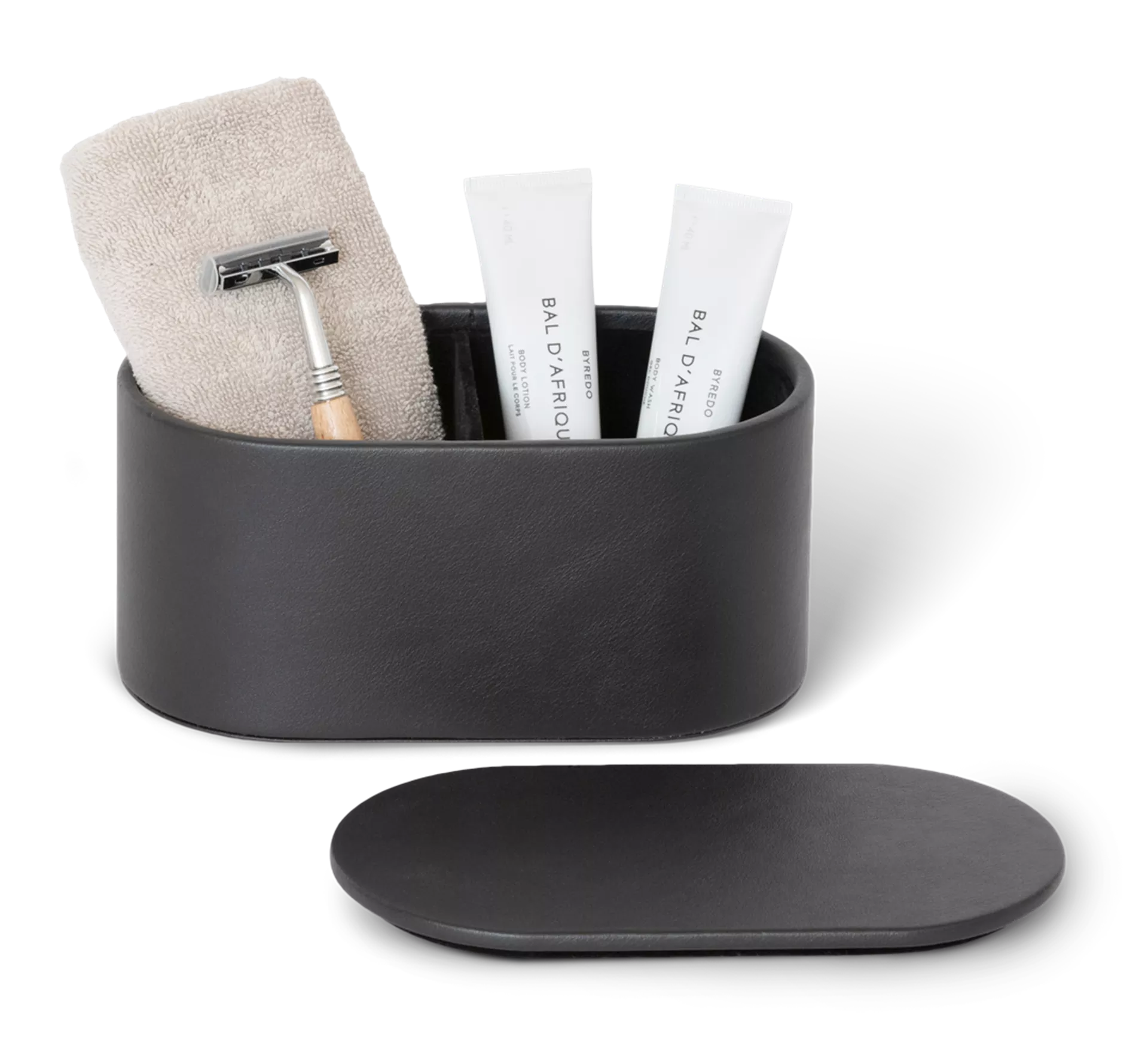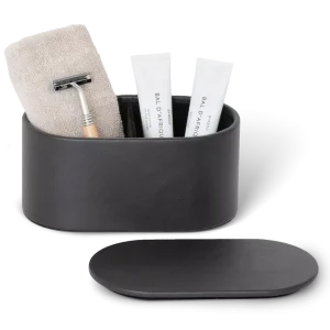 Svarti Bahia aukahlutakassinn okkar er bæði praktískur og glæsilegur í hverju baðherbergi. Hann er úr svörtu efni með fágaðri áferð og fínlegum saumum.