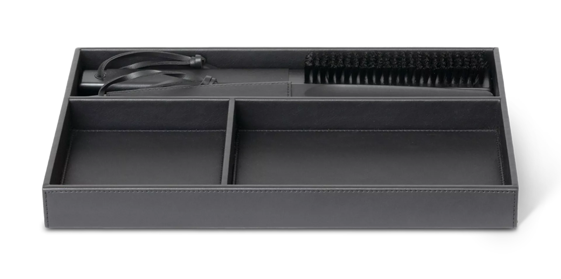 Cebu bakki í svörtu er ómissandi fyrir alla hótelfataskápa. Hannaður og saumaður úr lúxus svörtu efni, hannaður til að geyma nauðsynjar þínar á snyrtilegan hátt. Vatnsfráhrindandi og auðvelt að þrífa, fullkomin samsetning með Comino fataburstanum okkar og Falster skóhorni, sem tryggir að allt sé við höndina á stílhreinan og skipulagðan hátt.