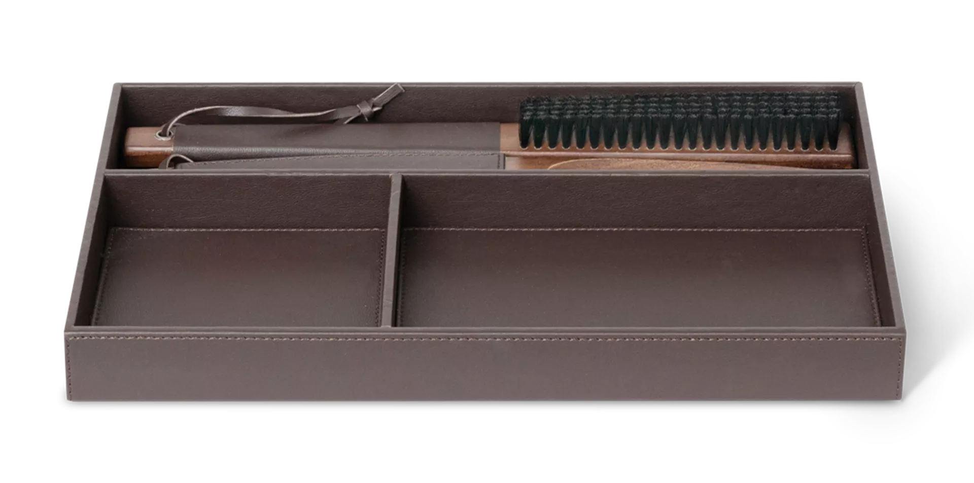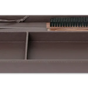 Cebu bakki í brúnu er ómissandi fyrir alla hótelfataskápa. Hannaður og saumaður úr lúxus brúnu efni, hannaður til að geyma nauðsynjar þínar á snyrtilegan hátt. Vatnsfráhrindandi og auðvelt að þrífa, fullkomin samsetning með Comino fataburstanum okkar og Falster skóhorni, sem tryggir að allt sé við höndina á stílhreinan og skipulagðan hátt.