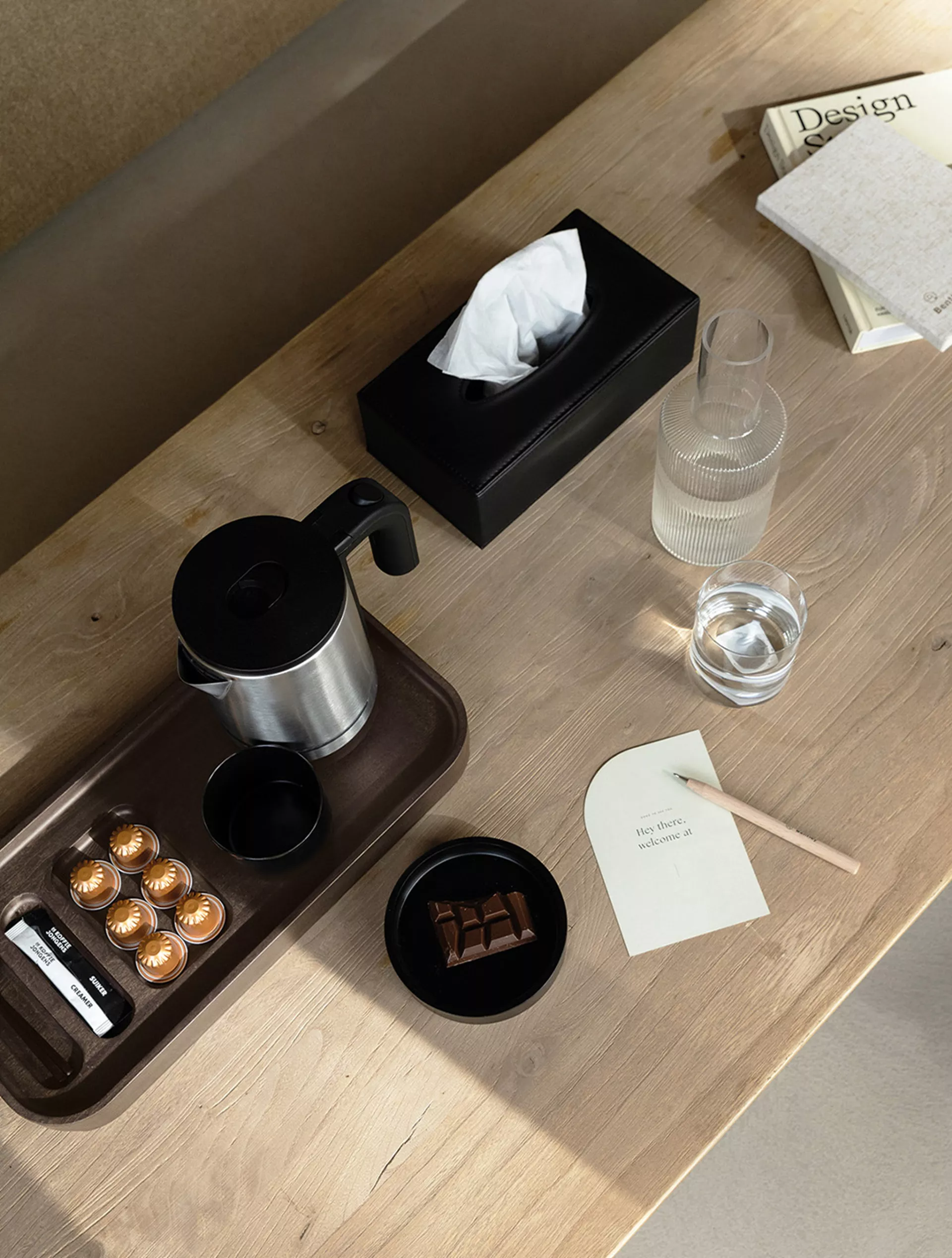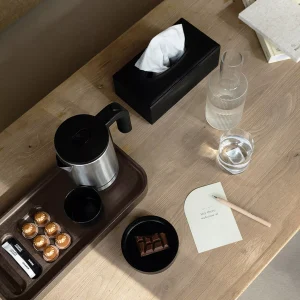 Ligna móttökubakkinn er nettur og praktískur hótelbakki sem heldur te- og kaffiaðstöðunni snyrtilegri. Hann býður upp á rými fyrir ketil, bolla og þrjú hólf fyrir bréfapoka, skeiðar eða aðra smáhluti.