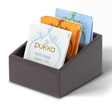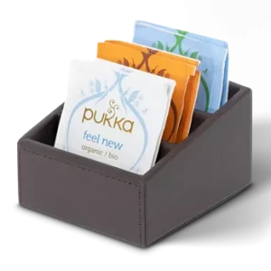 Lou kassinn undir tepoka er ómissandi viðbót við móttökubakkann okkar. Fullkomnaðu upplifun gesta með því að bæta við þeirra uppáhalds tei í þennan fágaða haldara. Kassinn er tilvalinn til að sýna og geyma tepoka, og vatnsfráhrindandi efnið tryggir að hann haldist hreinn og sé auðveldur í þrifum.