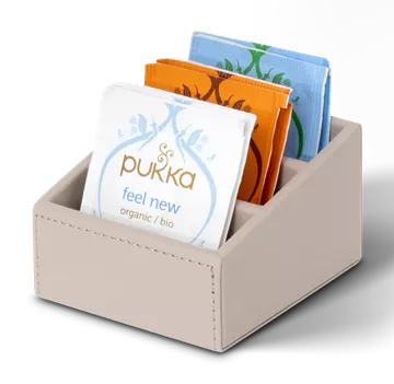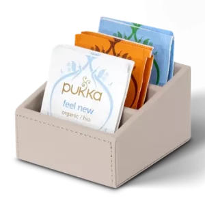 Lou kassinn undir tepoka er ómissandi viðbót við móttökubakkann okkar. Fullkomnaðu upplifun gesta með því að bæta við þeirra uppáhalds tei í þennan fágaða haldara. Kassinn er tilvalinn til að sýna og geyma tepoka, og vatnsfráhrindandi efnið tryggir að hann haldist hreinn og sé auðveldur í þrifum.