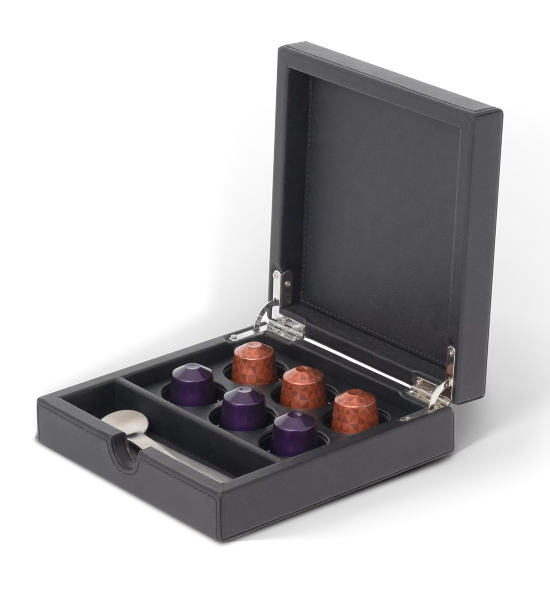 3 hólf til að geyma kaffihylki, tepoka og teskeiðar/hrærur. Innlegg sem hægt er að taka...